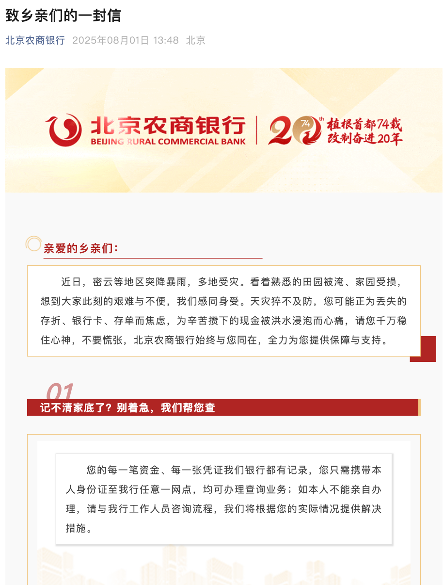 2025年8月1日,北京农商银行致乡亲们的一封信,在密云等暴雨受灾地区引发广泛共鸣。这封饱含温度的公开信,不仅精准回应了受灾群众在金融服务上的迫切需求,更以务实举措彰显了地方金融机构与民众共渡难关的责任担当,成为特殊时期金融服务 "人民性" 的生动注脚。